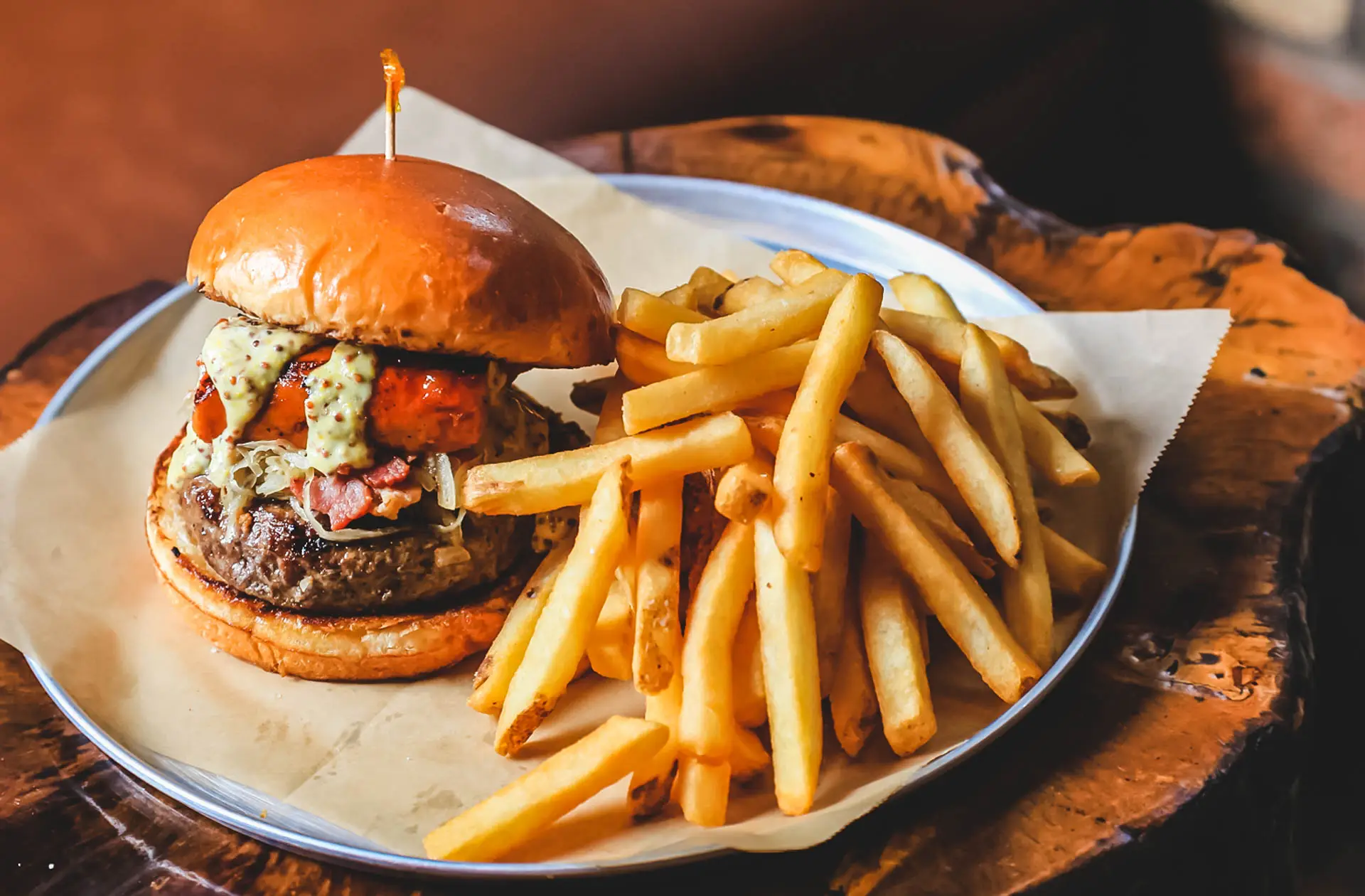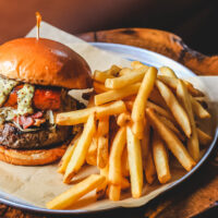 Natürlich der Burger (für den Vegetarier gibt es eine Alternative, bitte bei der Buchung angeben)